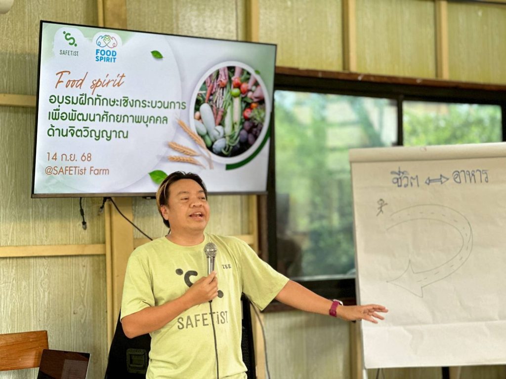 ช่วงกลางเดือนกันยายนที่ผ่านมา SAFETist Farm ชุมชนอาหารเล็ก ๆ ริมคลองบางมด เขตทุ่งครุ ที่ก่อตั้งขึ้นจากความตั้งใจของกลุ่มคนที่อยากเห็นอาหารปลอดภัยและชุมชนที่เข้มแข็ง เป็นทั้งพื้นที่เรียนรู้เกษตรอินทรีย์และความมั่นคงทางอาหาร พื้นที่ชุมชน และจุดเชื่อมโยงคนเมืองกับธรรมชาติ ได้จัดกิจกรรมพัฒนาศักยภาพแกนนำด้านจิตวิญญาณอาหาร จำนวน 16 คน โดยใช้เครื่องมือ Food Spirit Modules เช่น “สายธารชีวิตกับอาหาร” “วิเคราะห์ระบบอาหาร” และ “Mindful Eating” เพื่อฝึกมองเห็นความเชื่อมโยงของอาหารกับชีวิตและระบบอาหารโดยรอบ วิถีวัยเด็ก ความอบอุ่นในครอบครัวที่สัมพันธ์กับมื้ออาหารได้ถูกนำมาถ่ายทอดสู่กันฟัง และเห็นพ้องร่วมกันว่าวัยทำงานที่ก้าวห่างจากบ้าน กลับมีวิถีการกินที่ไม่ดีต่อสุขภาพ ทำให้หลายคนเริ่มอยากปรับเปลี่ยน